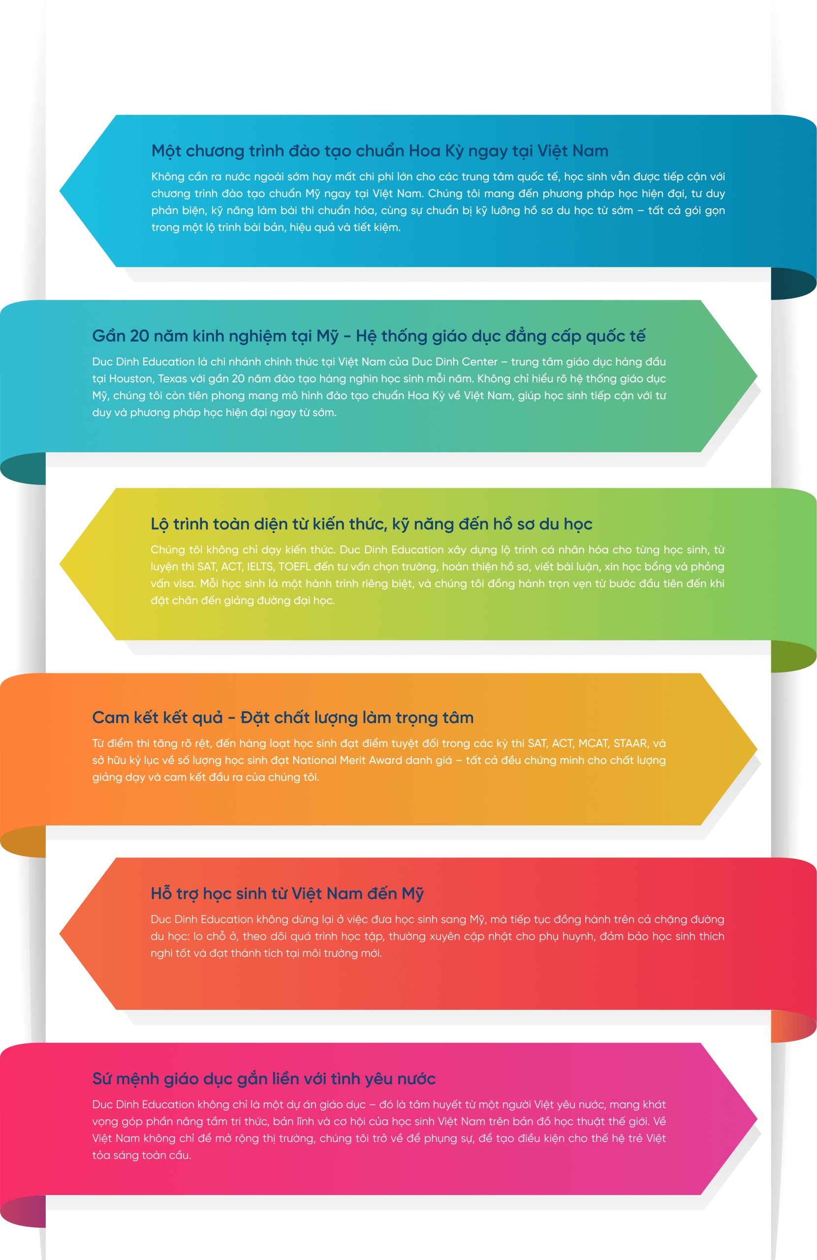 Với gần 20 năm kinh nghiệm từ hệ thống Duc Dinh Center tại Houston – Texas (Hoa Kỳ), chương trình “Du học trọn gói” của Duc Dinh Education Vietnam ra đời như một cánh tay nối dài, giúp học sinh Việt Nam tự tin sánh vai cùng bạn bè quốc tế tại những đại học danh giá nhất nước Mỹ